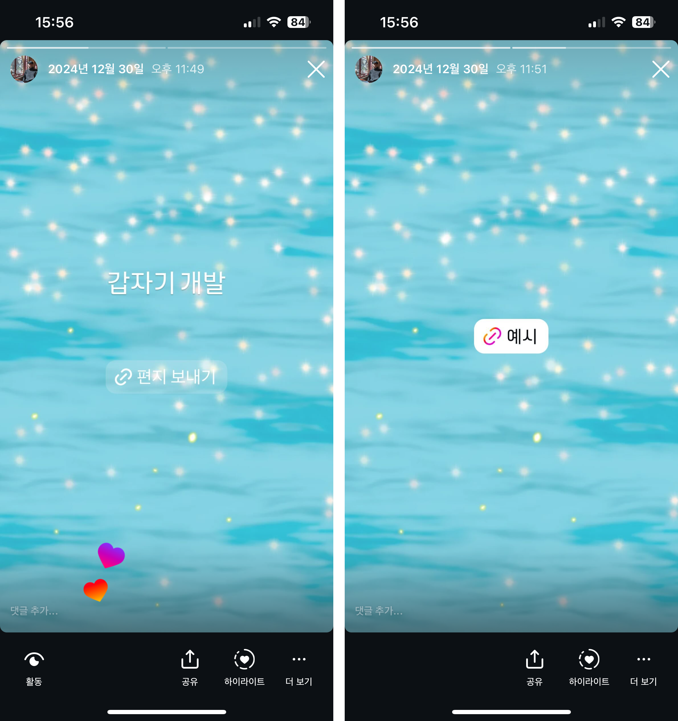 스토리 특성 상 볼 사람은 보고 안 볼 사람은 안보기 때문에 '그냥 내가 이런걸 만들었다' 정도의 뉘앙스만 전달하고자 했습니다.